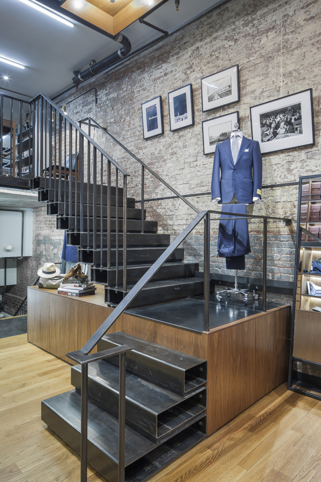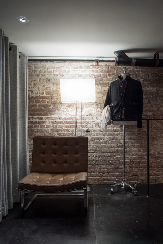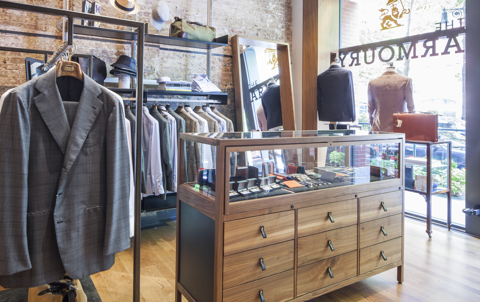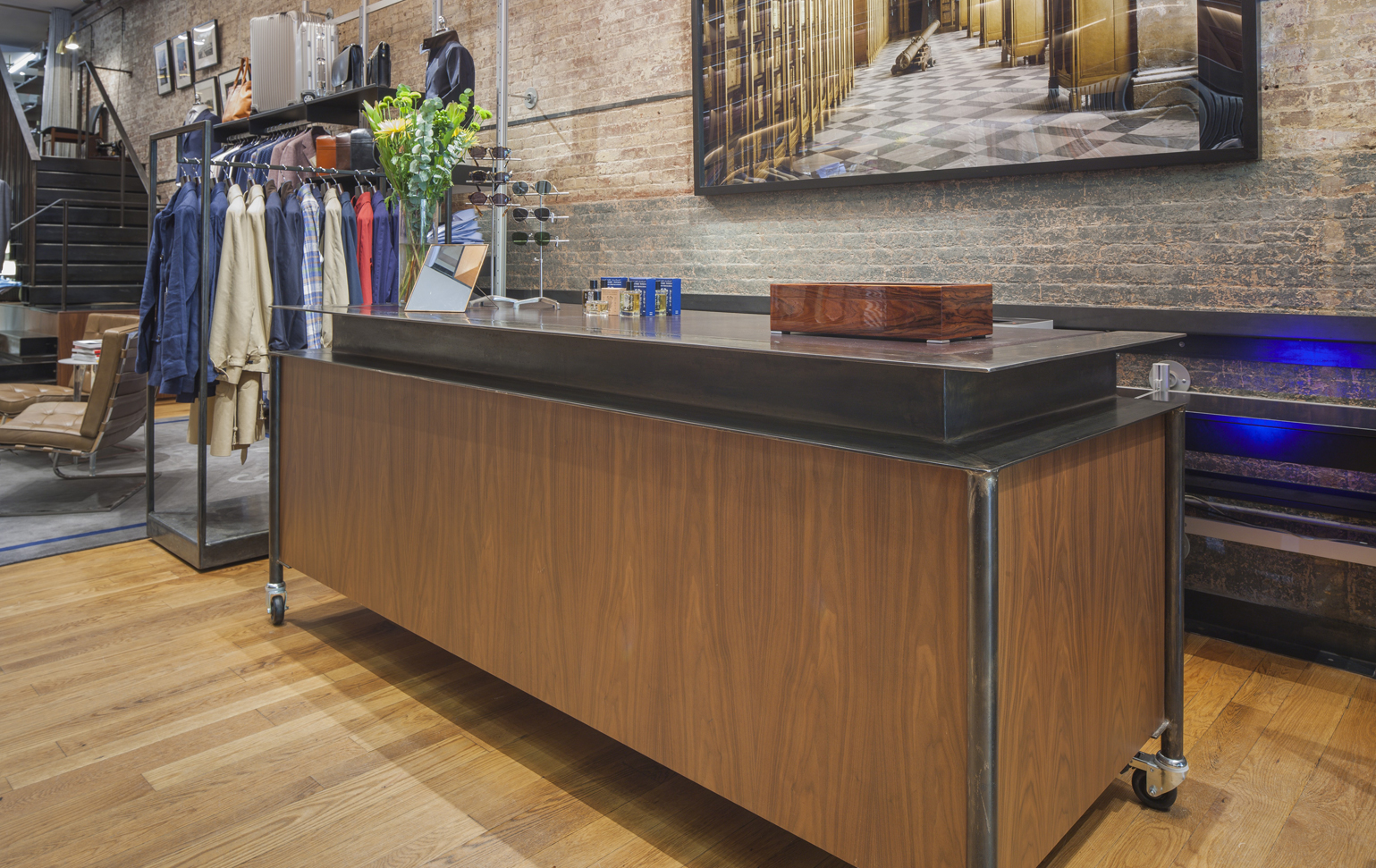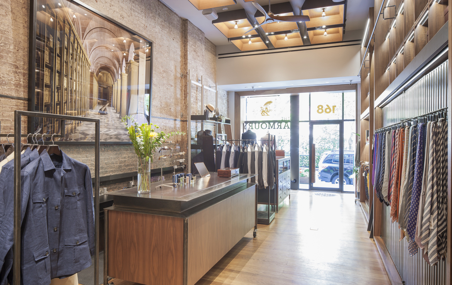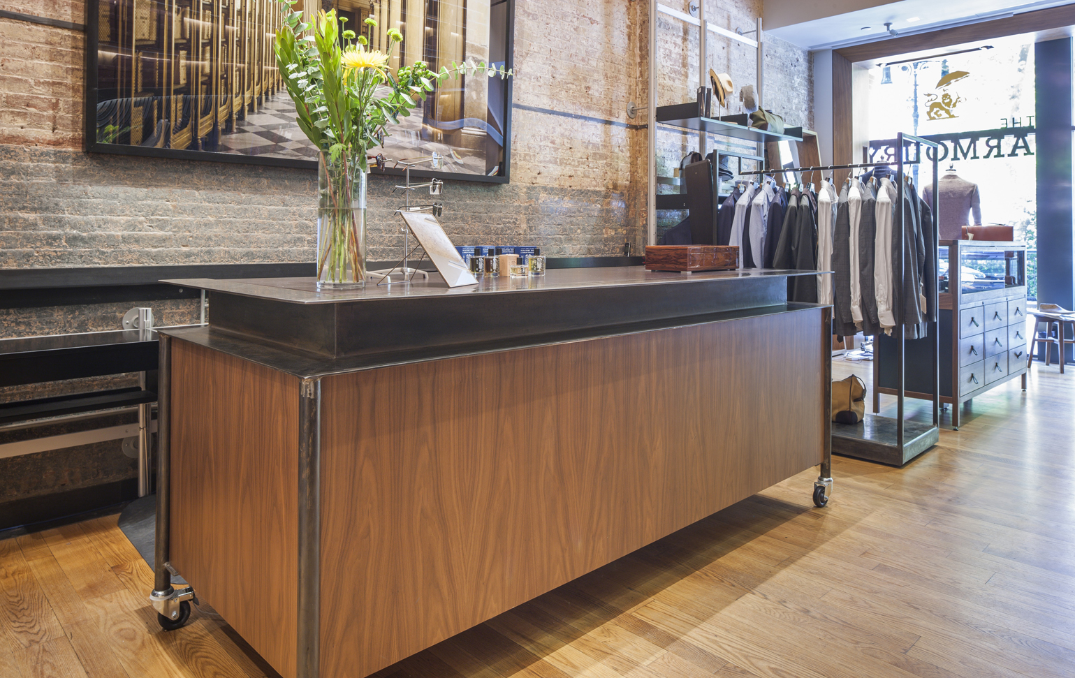 Located in a pre-war building in New York City’s Tribeca area, The Armoury NYC houses three stories of ready to wear and bespoke menswear garments and accessories. Co-designed with my friend and colleague from Rhode Island School of Design, Greg Yang, we created a space that respected the heritage of the building as well as aligning with the brand’s identity. The existing brick wall, wood floors, a NYC manhole and vintage heat radiators were elements that we kept and integrated into the store alongside the signature wall to ceiling walnut cabinets with rolling ladders. Walking across the space under an array of coffer ceilings, a black metal staircase leads to the mezzanine level of the store housing bespoke shoes. Next to a row of changing rooms, stairs leading down to the basement opens into the back of house office, pantry, as well as a private VIP area connected to an open space for cigar breaks. We very much enjoyed designing this space, and if you have the pleasure of visiting the store, we hope you will enjoy the many small details that we put into it.