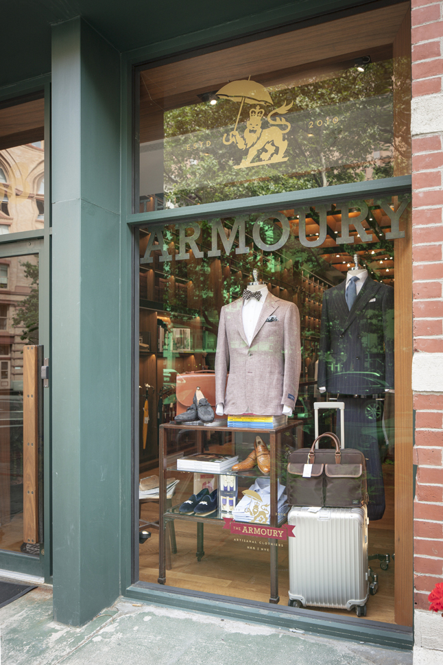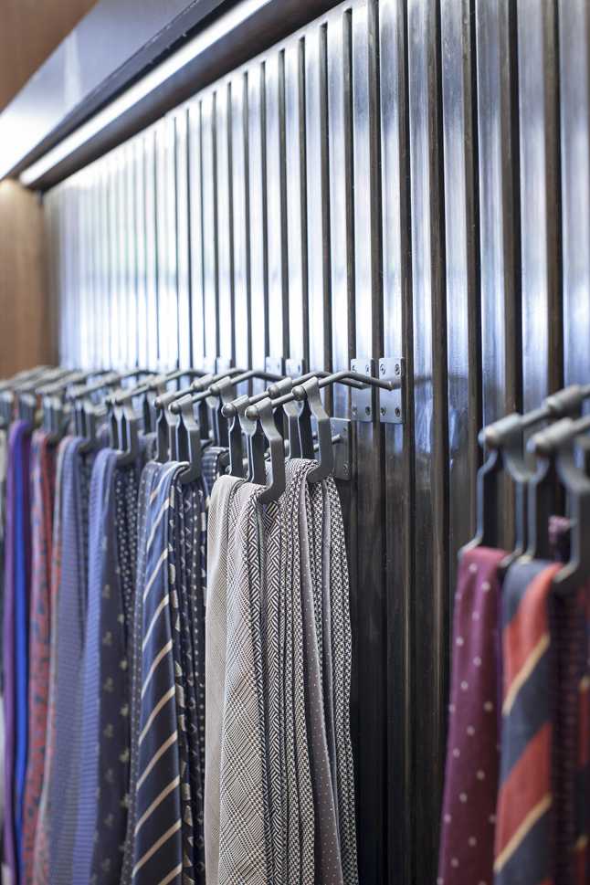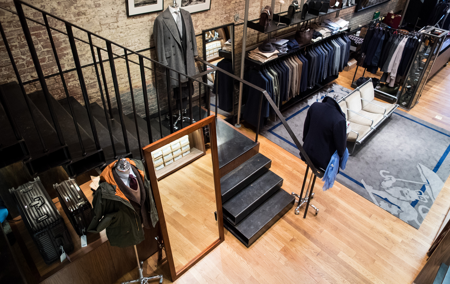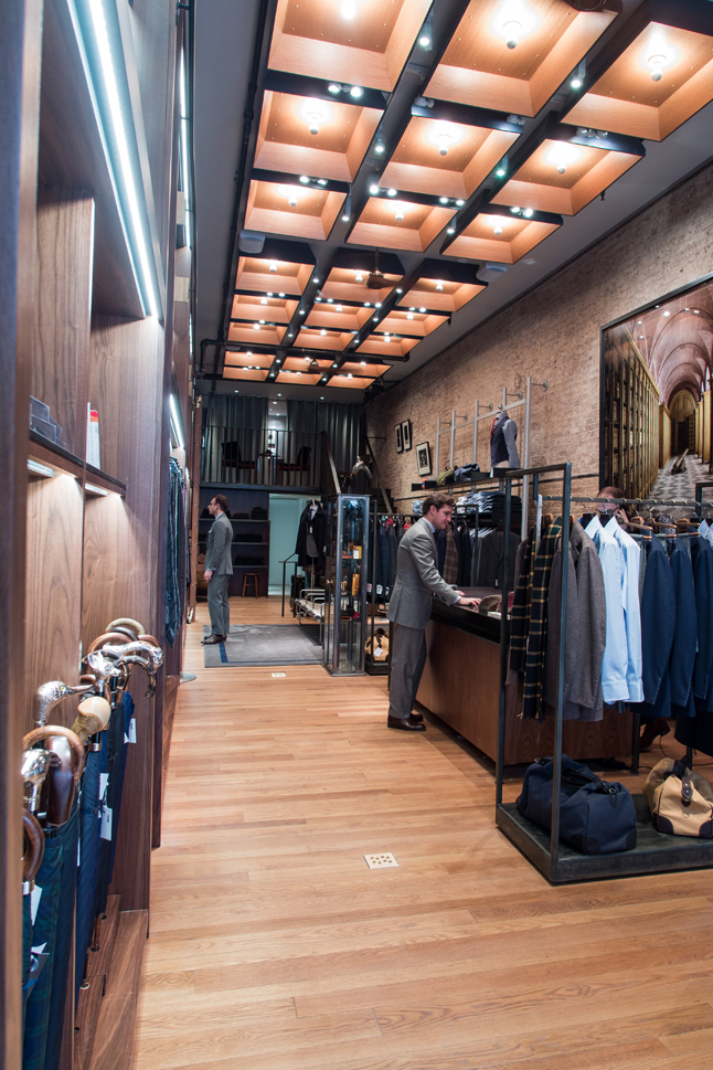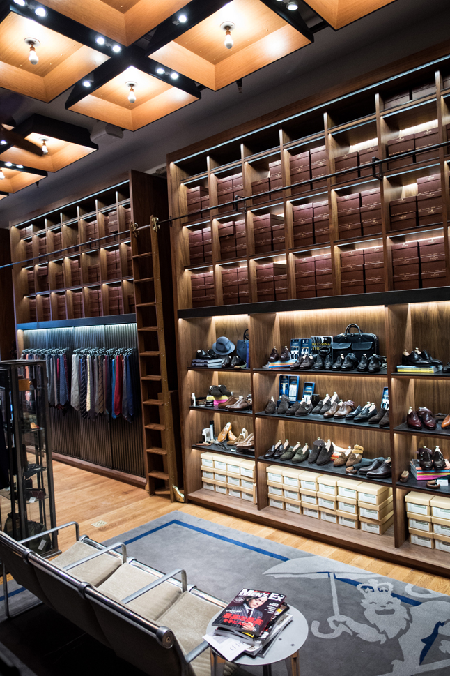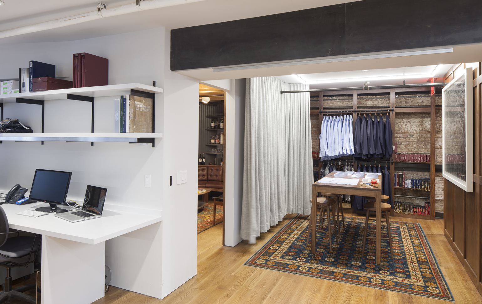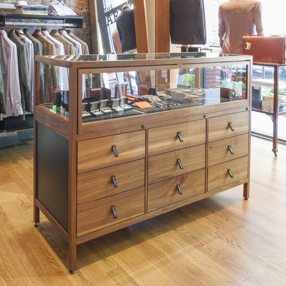 Located in a pre-war building in New York City’s Tribeca area, The Armoury NYC houses three stories of ready to wear and bespoke menswear garments and accessories. Co-designed with my friend and colleague from Rhode Island School of Design, Greg Yang, we created a space that respected the heritage of the building as well as aligning with the brand’s identity. The existing brick wall, wood floors, a NYC manhole and vintage heat radiators were elements that we kept and integrated into the store alongside the signature wall to ceiling walnut cabinets with rolling ladders. Walking across the space under an array of coffer ceilings, a black metal staircase leads to the mezzanine level of the store housing bespoke shoes. Next to a row of changing rooms, stairs leading down to the basement opens into the back of house office, pantry, as well as a private VIP area connected to an open space for cigar breaks. We very much enjoyed designing this space, and if you have the pleasure of visiting the store, we hope you will enjoy the many small details that we put into it.