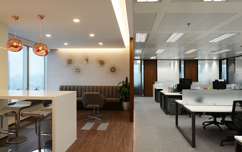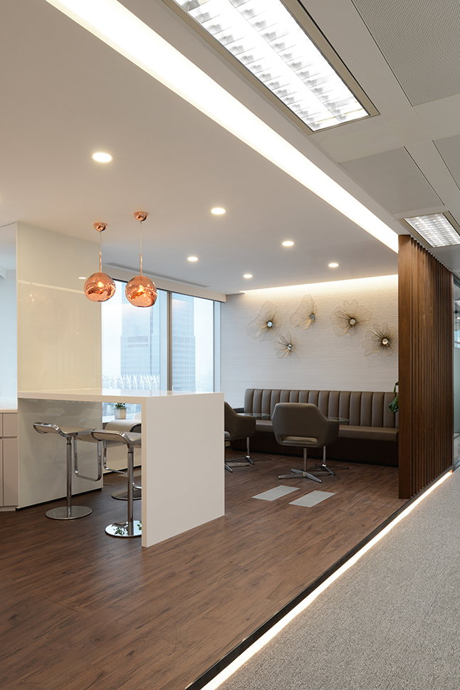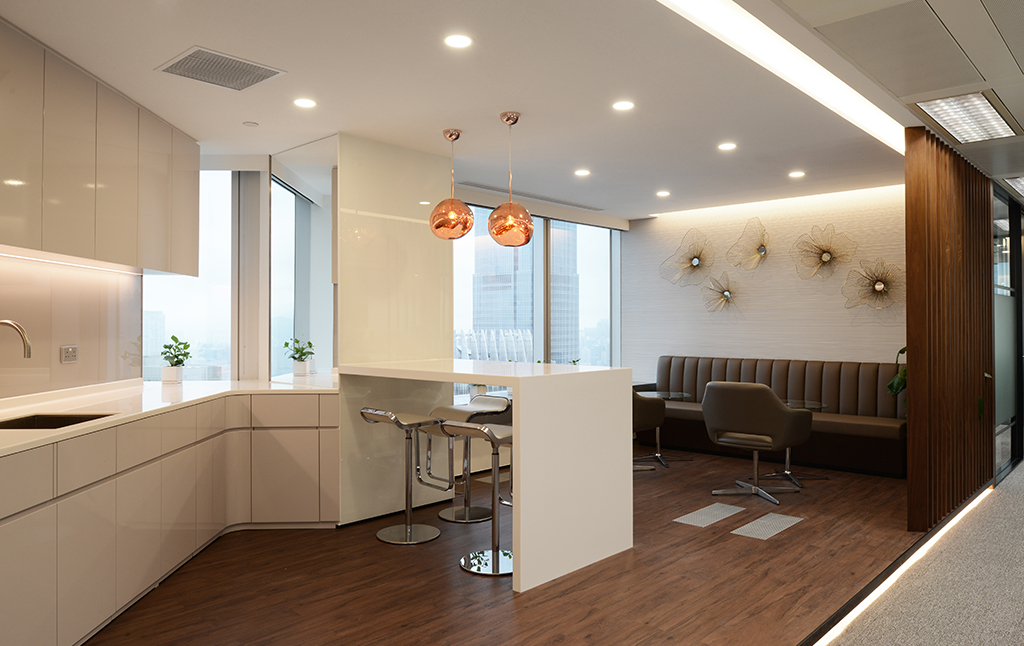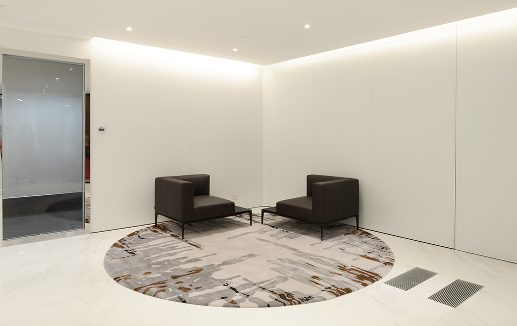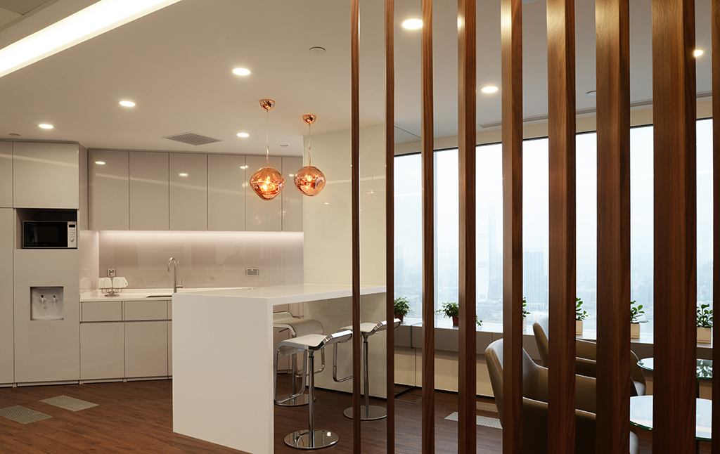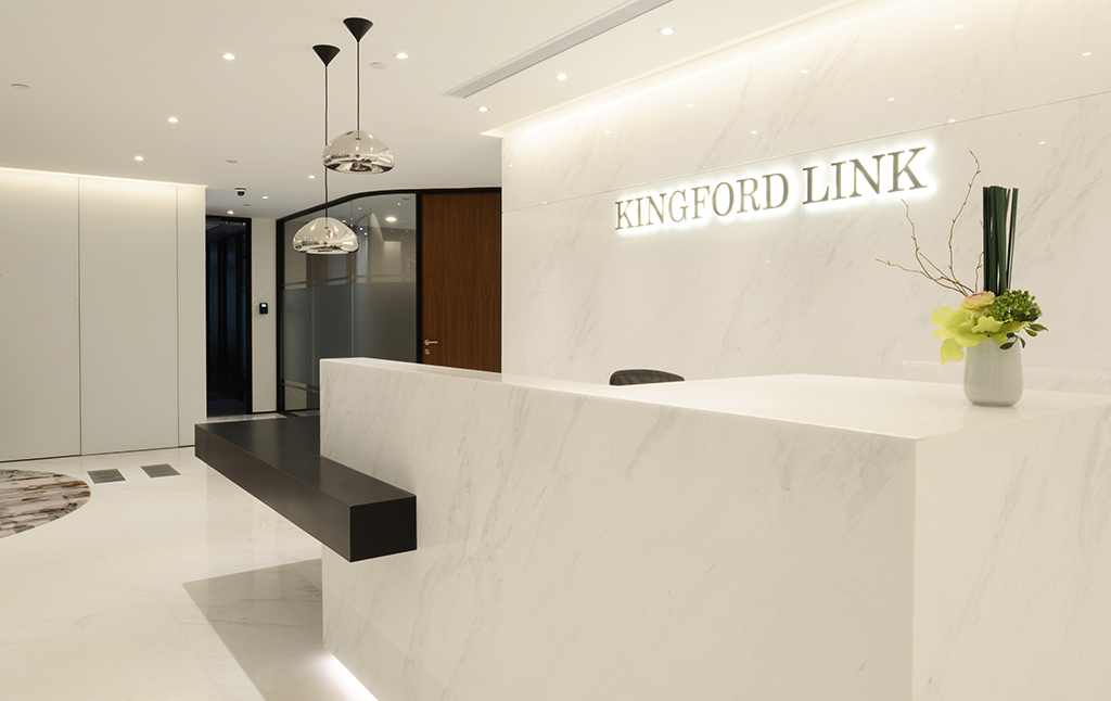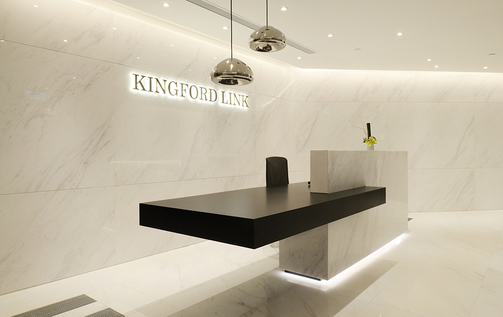 The headquarters of a corporate Chinese company, Kingford Link’s design can be described as an east meets west contemporary and minimal interior space. Our design team drew inspiration from traditional Chinese and contemporary Western designs to create a modern and practical working environment. The circular door handle of the boardroom echos that of a traditional Chinese entrance as well as symbolizes good fortune. Aligning with Feng Shui, our design is based on an open plan office with peripheral private offices. White marble was used in the reception foyer to create a luxurious and bright environment to receive guests. An open pantry with slotted wood partition allows employees to take breaks within a semi private area that encourages a more positive working environment and open communication. The monocromatic colours and warm material palette create a bright and cozy ambience to balance the interior comfort level establishing a more efficient working environment.