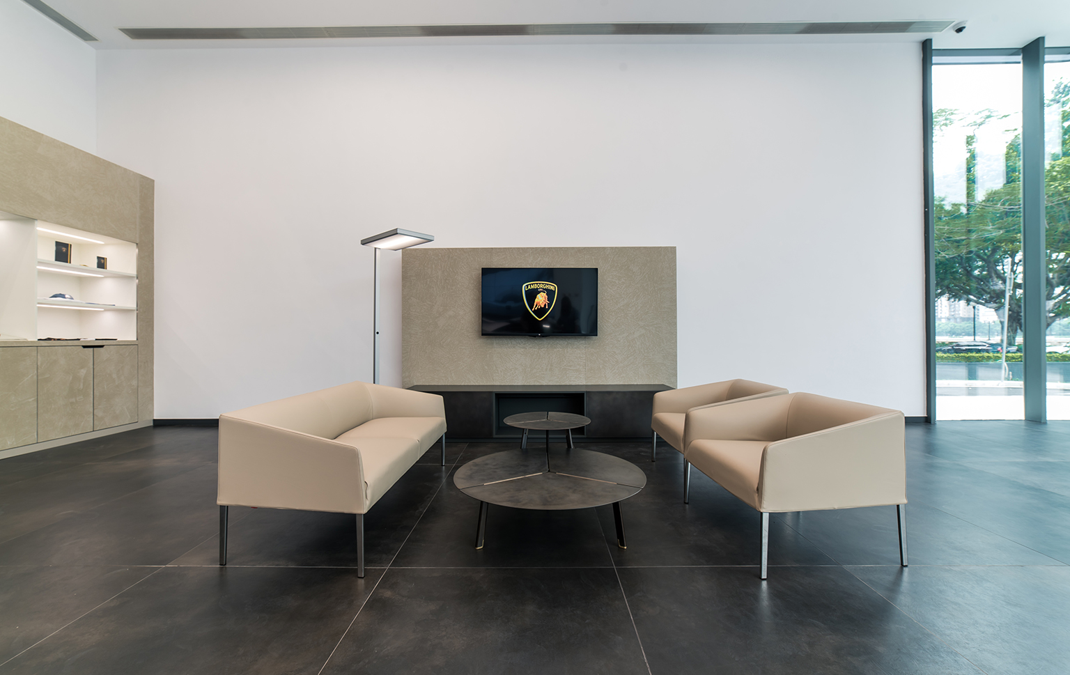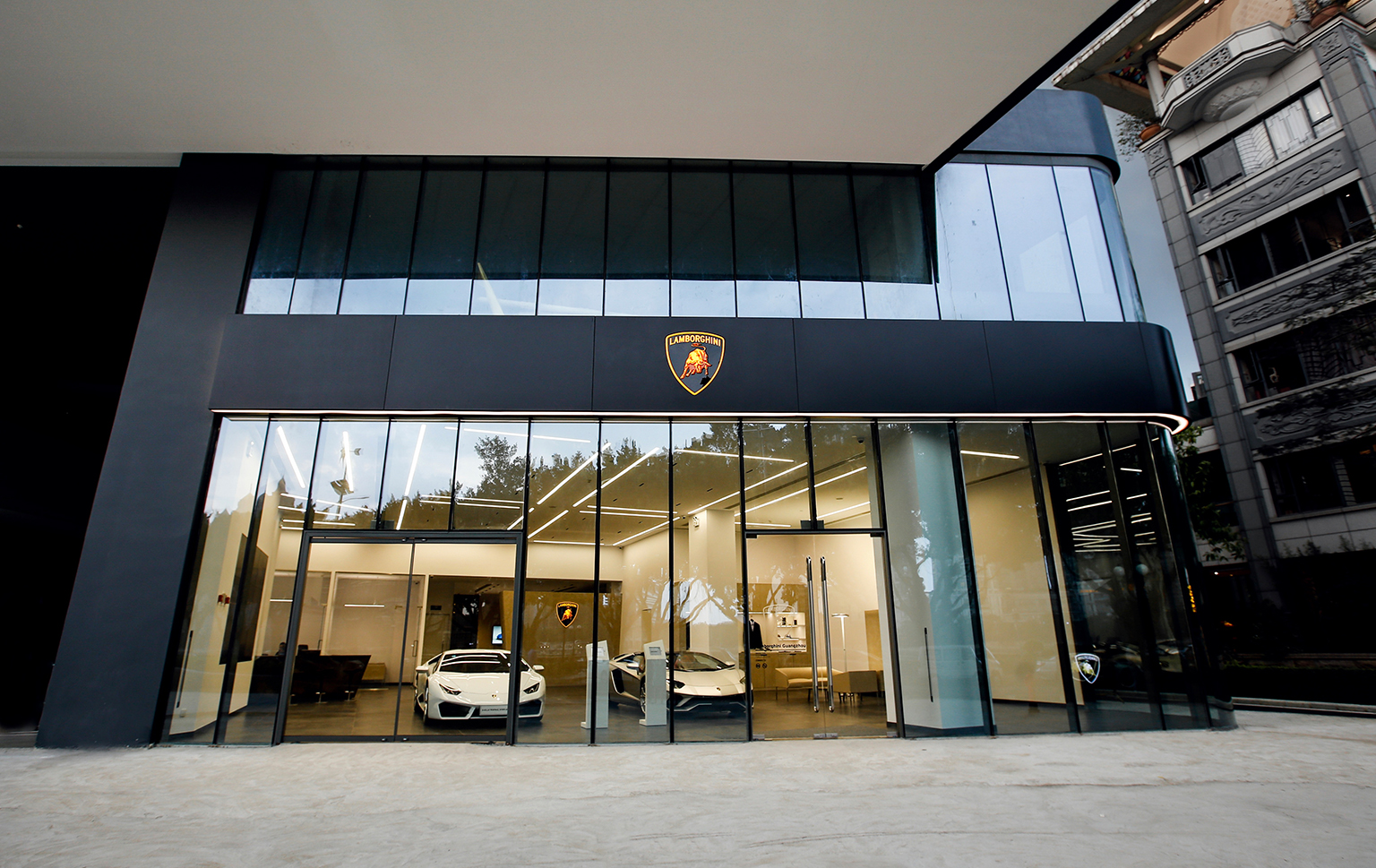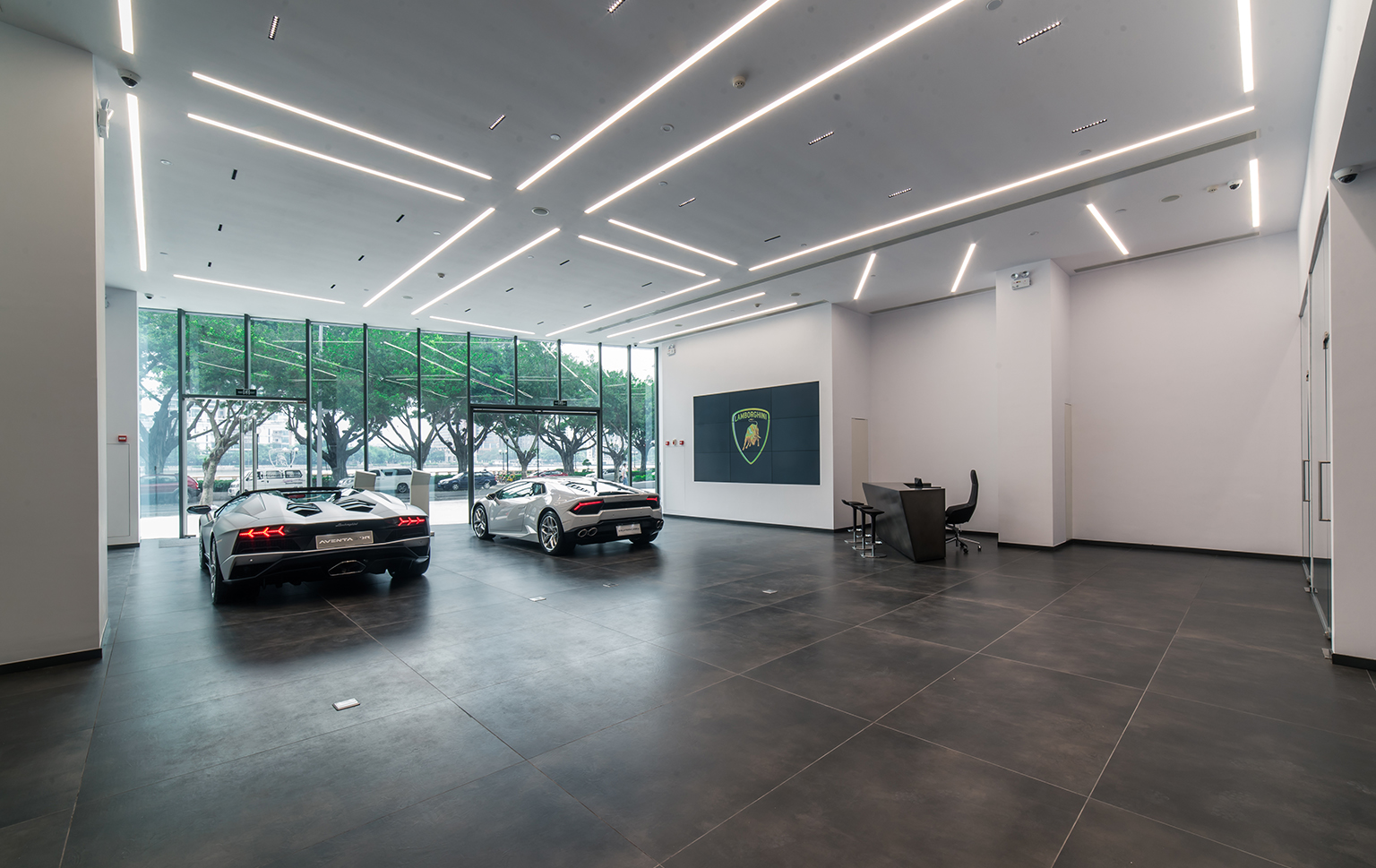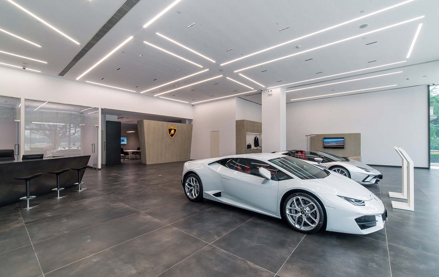 The Guangzhou Lamborghini Showroom design brief was to renovate the space based on Lamborghini’s corporate identity. It is in most part a project management role but also incorporating design details to enhance the space and make it more functional and unified. We worked to integrate the back of house spaces not specified by the company and also the detailing to consolidate the HVAC systems, fire systems, as well as plumbing to realize the space in a minimal manner coherant to the corporate identity. We designed the exterior parking area with a custom stone flooring pattern to enhance the welcome experience for their customers.