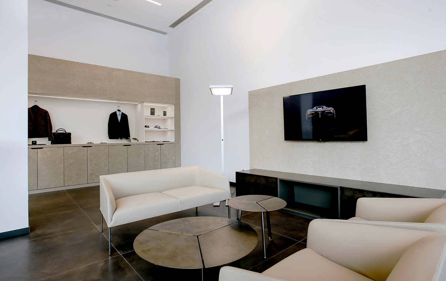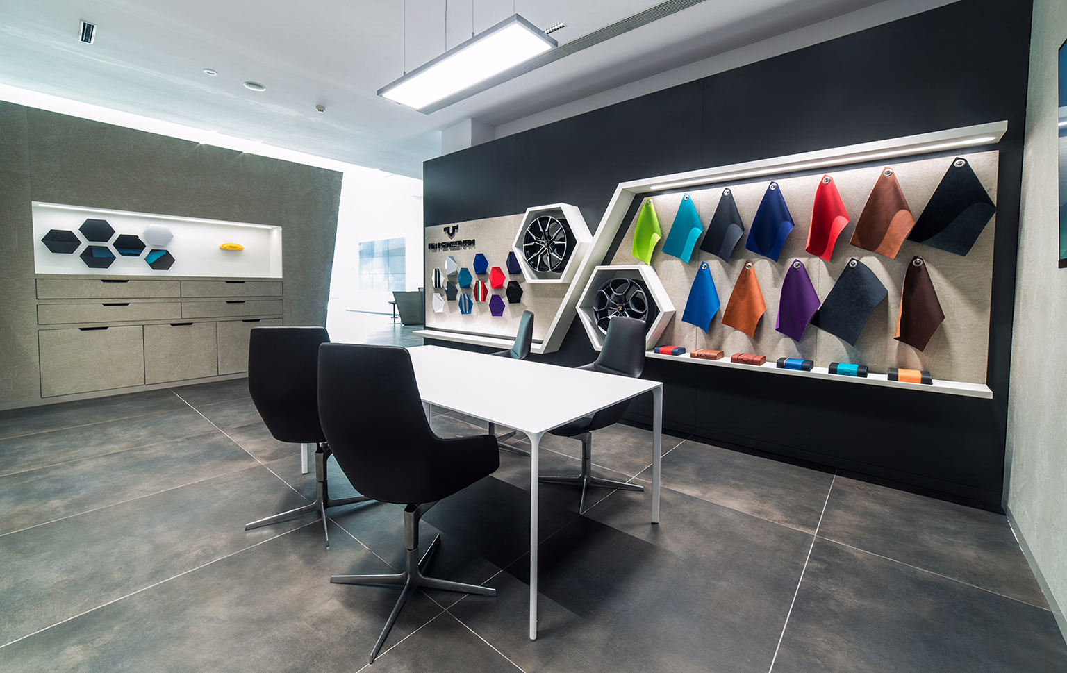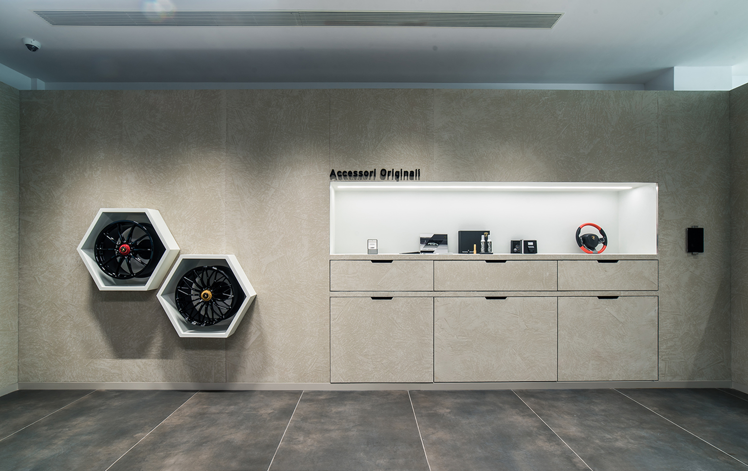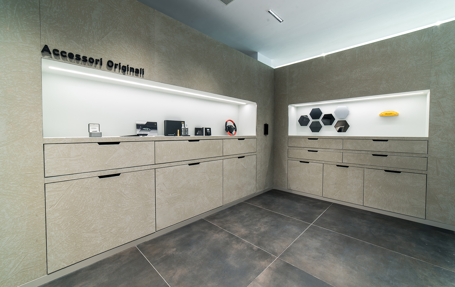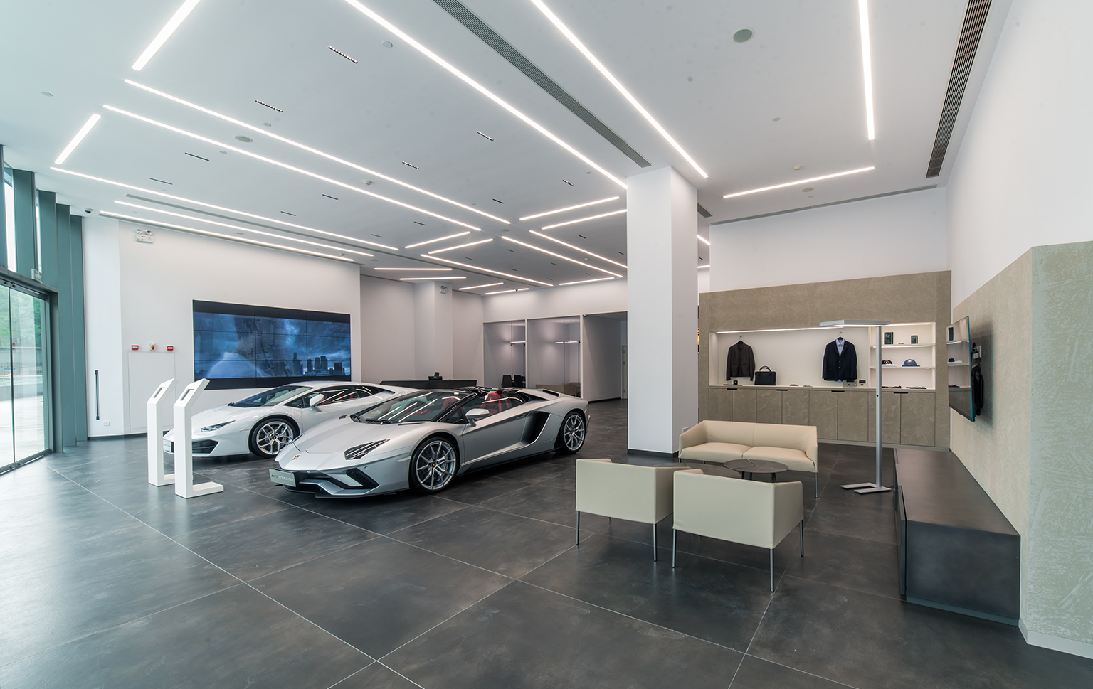 The Guangzhou Lamborghini Showroom design brief was to renovate the space based on Lamborghini’s corporate identity. It is in most part a project management role but also incorporating design details to enhance the space and make it more functional and unified. We worked to integrate the back of house spaces not specified by the company and also the detailing to consolidate the HVAC systems, fire systems, as well as plumbing to realize the space in a minimal manner coherant to the corporate identity. We designed the exterior parking area with a custom stone flooring pattern to enhance the welcome experience for their customers.