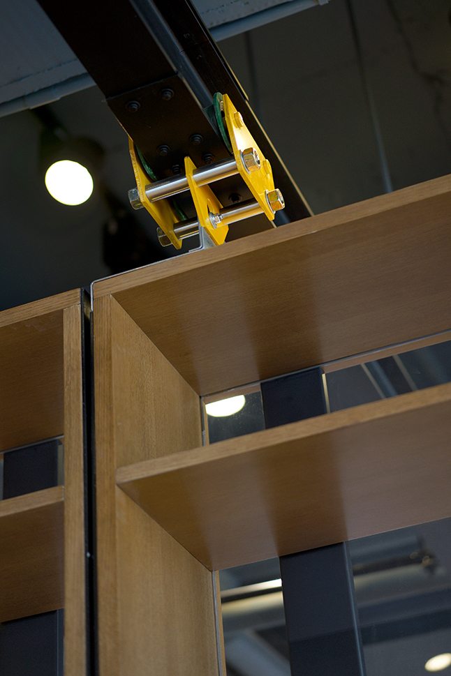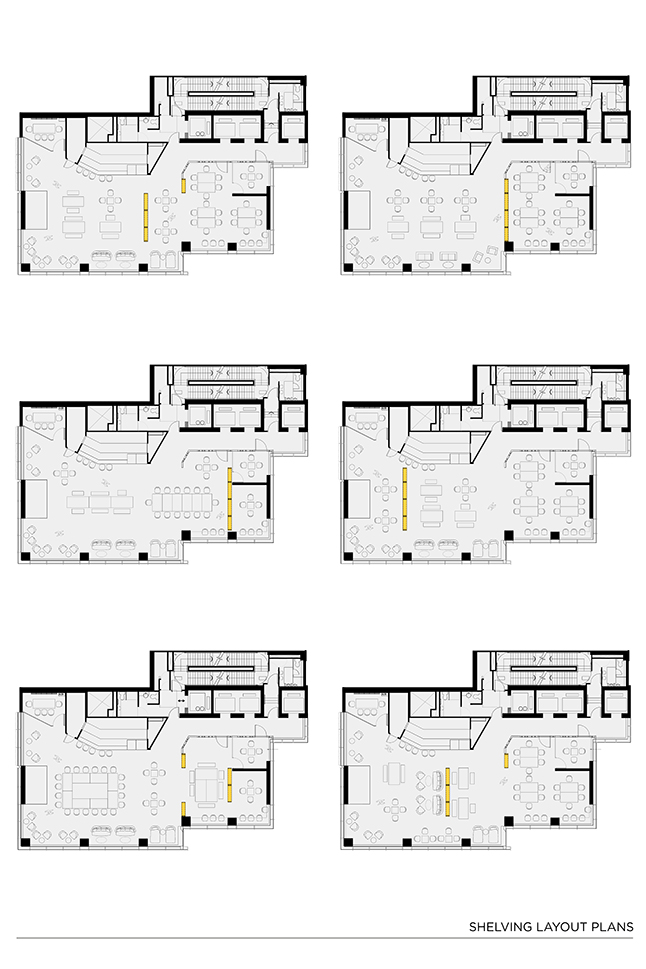A series of mobile shelving run along I-beam ceiling tracks designed to adapt and facilitate different events. The bookshelves shift and dissect the open area to create an ever-changing interior to accommodate for events from cocktail parties, dinner gatherings, lectures, to meeting rooms for smaller functions. A stage on wheels can be moved around to provide extra versatility during talks and start-up pitches.
